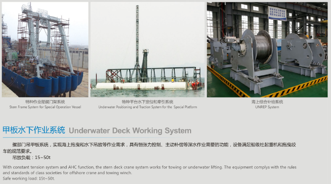 艉部門吊甲板系統(tǒng),實(shí)現(xiàn)海上拖曳和水下吊放等作業(yè)需求,具有恒張力控制、主動補(bǔ)償?shù)壬钏鳂I(yè)需求的功能,設(shè)備滿足船級社起重機(jī)和拖曳絞車的規(guī)范要求。