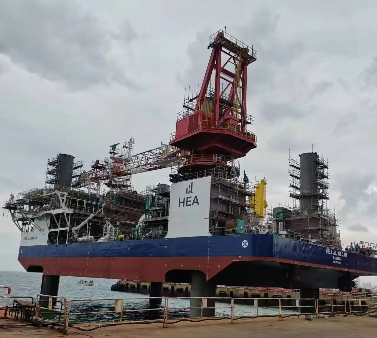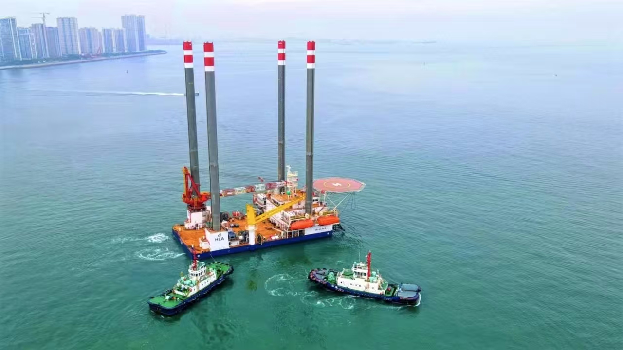 9月27日,TYPE3 PRO第二座自升式海上作業(yè)支持平臺(tái)下水后,經(jīng)過(guò)升降系統(tǒng)調(diào)試,四條樁腿平穩(wěn)扎進(jìn)海底實(shí)現(xiàn)了平臺(tái)站樁,隨后開(kāi)展了平臺(tái)樁腿接長(zhǎng)工作。